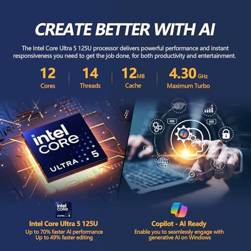 About this item 【Processor】Powered by Intel Core Ultra 5 125U with 12 cores (2 Performance, 8 Efficient, 2 Low-Power) and 14 threads, delivering seamless multitasking and productivity. Its hybrid design balances performance and efficiency, reaching up to 4.3 GHz (P-cores) and 3.6 GHz (E-cores) for speed and responsiveness. Ideal for business, data analysis, content creation,…